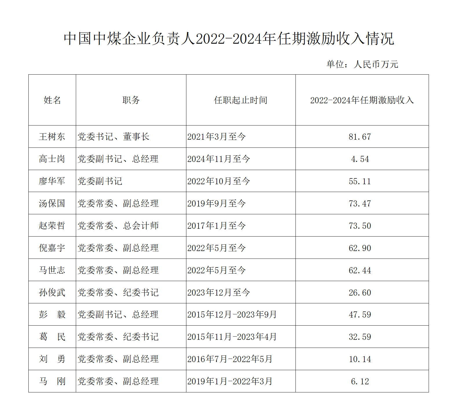 中國中煤企業(yè)負(fù)責(zé)人2022-2024年任期激勵收入情況