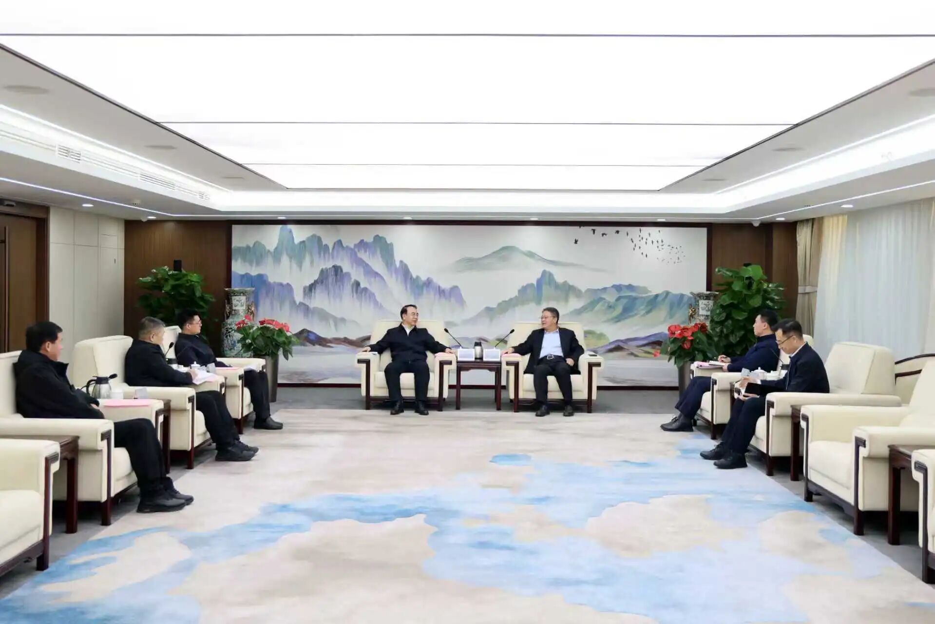 11月27日,中國中煤黨委書記、董事長王樹東在集團總部會見黑龍江省七臺河市委書記陳延良,雙方圍繞加強企地協同、拓展合作領域開展座談交流。七臺河市副市長雷東升參加會見。