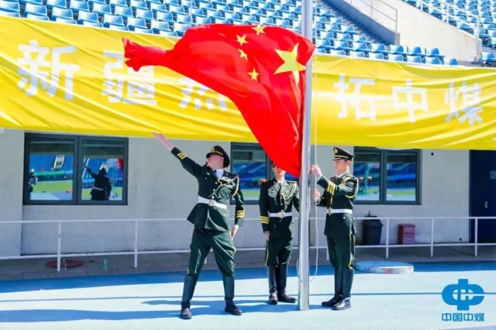 開幕式伊始,國旗護(hù)衛(wèi)隊(duì)擁著鮮艷的五星紅旗踏步而來,緊跟國旗之后的是中國中煤司旗、司徽,寓意中國中煤緊跟國家步伐,把握時代脈搏,發(fā)展勢頭迅猛。